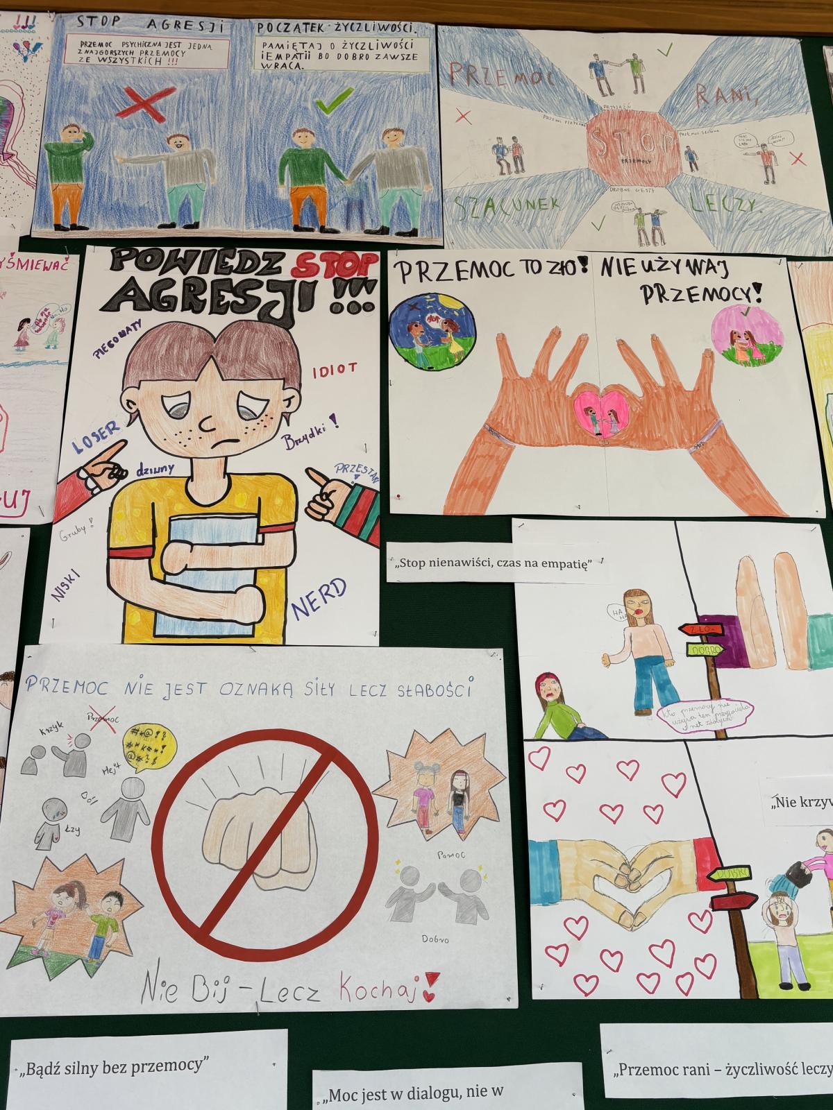 Przeprowadzone zostały godziny wychowawcze nawiązujące do tej tematyki, lekcje informatyki o cyberprzemocy, zaprojektowane i wydrukowane zostały foldery. Uczniowie na lekcjach plastyki wykonali niesamowite plakaty pod hasłem "STOP PRZEMOCY".