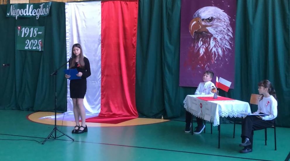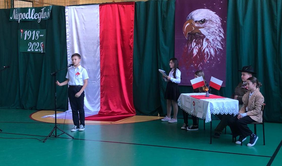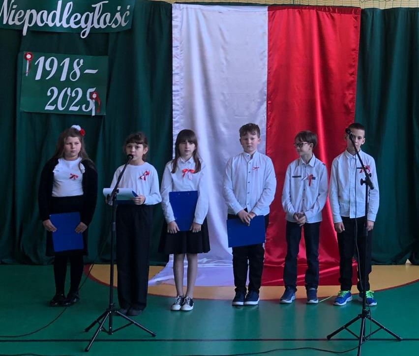 11 listopada - to jeden z najważniejszych dni w historii narodu polskiego - dzień odzyskania przez Polskę niepodległości. Nasza Ojczyzna po 123 latach niewoli odzyskała swoją upragnioną wolność. Właśnie dla upamiętnienia tego wydarzenia 7 listopada w naszej szkole odbyła się uroczysta akademia przygotowana przez uczniów klas I, III, IV, V, VI i VII, pod opieką Pani Ireny Jewulskiej i Pani Urszuli Baziak. Piękna, w barwach narodowych scenografia oraz kotyliony i kokardki, zdobiące pierś uczestników wydarzenia, dodały powagi uroczystości. Program artystyczny składał się z dwóch części: przedstawienia patriotycznego oraz koncertu pieśni patriotycznych. Na początku akademii młodzi artyści przypomnieli historię i znaczenie symboli narodowych. Potem odśpiewano hymn państwowy: „Mazurek Dąbrowskiego”. Kolejno występujący zaprezentowali przedstawienie w formie programu telewizyjnego „Pod polską strzechą”, w którym znani i zasłużeni dla Polski artyści: wokalistka - Edyta Górniak, poetka -Wisława Szymborska raz pan leśniczy odpowiadali na pytanie: „Czym dla nich jest Ojczyzna?”. Przekonaliśmy się, że słowo Ojczyzna dla każdego może znaczyć coś innego, ale ma wielką wartość. Na zakończenie pierwszej części uczniowie zaprezentowali scenkę „Ojczyzna moich marzeń”. Młodzi artyści utwierdzili zebranych w przekonaniu, że wszyscy powinniśmy dbać o nasz wspólny dom, któremu na imię Polska. W trakcie przedstawienia wysłuchaliśmy śpiewu piosenek: „Flaga Polski”, „Zachwyca nas Polska”, i „To moja Polska”, które podkreśliły piękno i wyjątkowość naszej Ojczyzny.