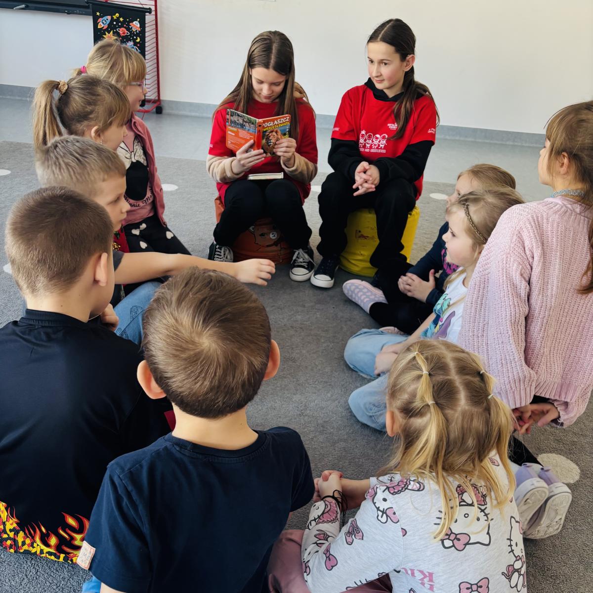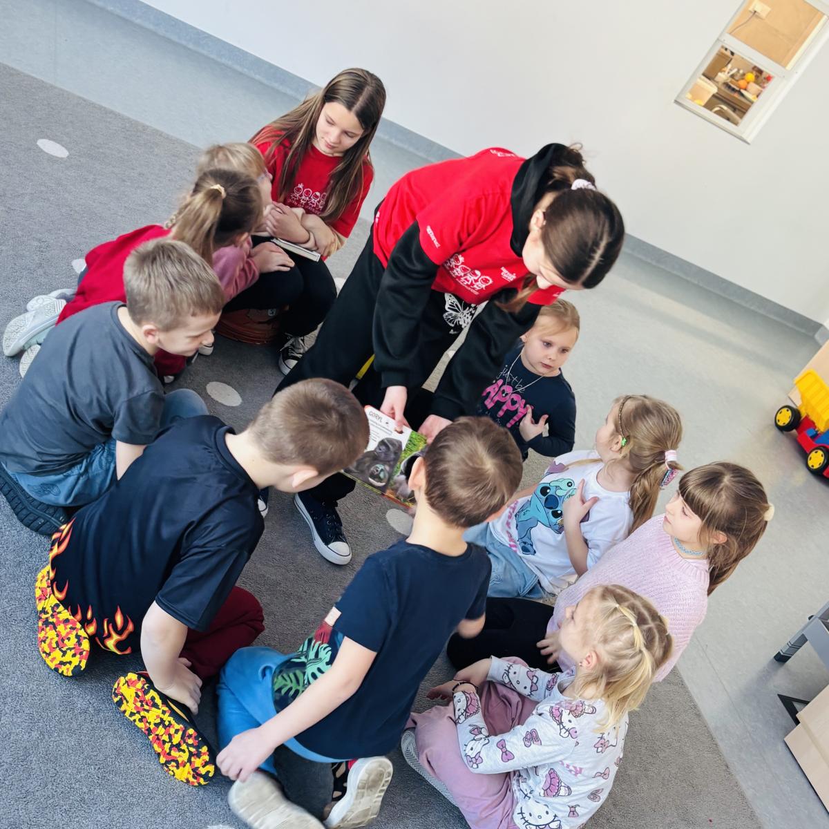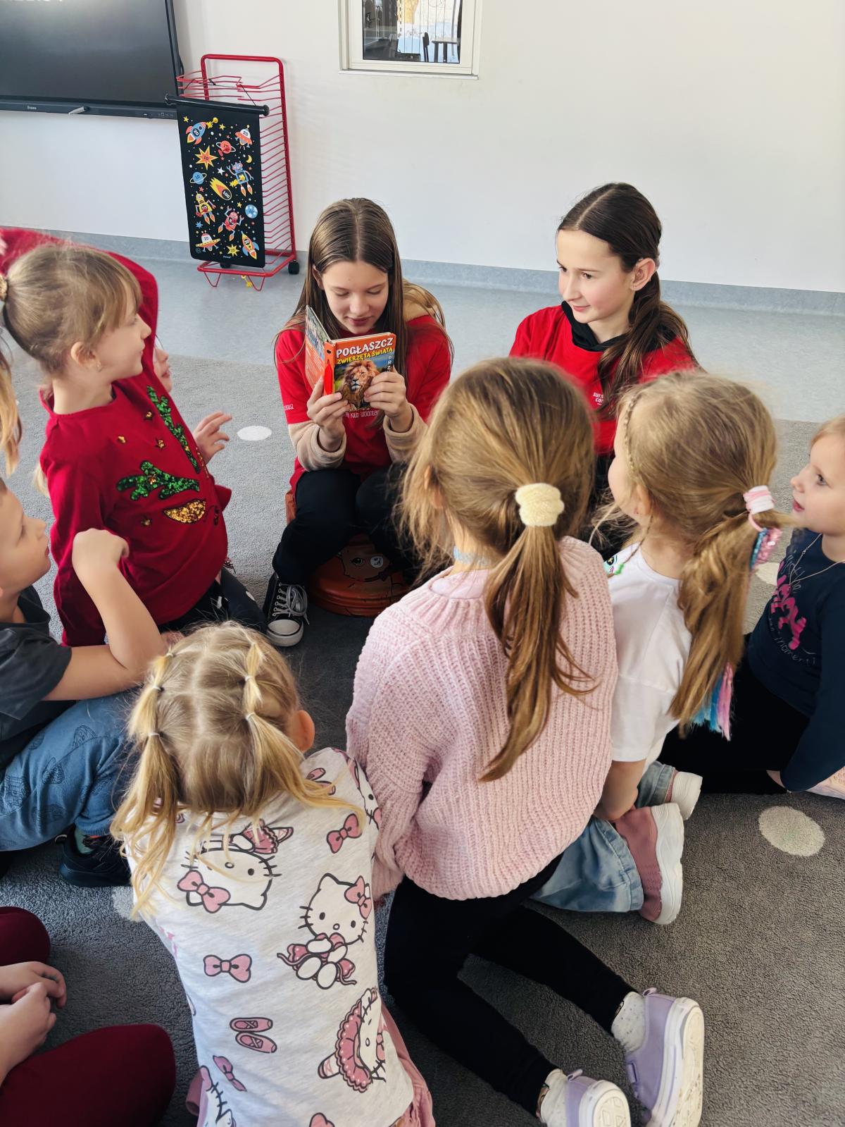 W naszej szkole odbywa się wyjątkowa inicjatywa, która łączy uczniów starszych klas z najmłodszymi. Co tydzień wolontariusze odwiedzają przedszkolaków, aby wspólnie przenieść się w świat bajek, opowiadań i dziecięcej wyobraźni. Podczas spotkań uczniowie starszych klas czytają wybrane książki, rozmawiają z dziećmi o bohaterach i uczą się wzajemnie uważności oraz empatii. Dla przedszkolaków jest to czas radości, nauki słuchania i rozwijania miłości do książek, a dla starszych uczniów - cenna lekcja odpowiedzialności i zaangażowania społecznego. Cieszymy się, że ta inicjatywa na stałe wpisała się w kalendarz szkolnych działań i dziękujemy wszystkim wolontariuszom za ich czas, serce i uśmiech, którym dzielą się każdego tygodnia. (tekst: J. Cisoń)